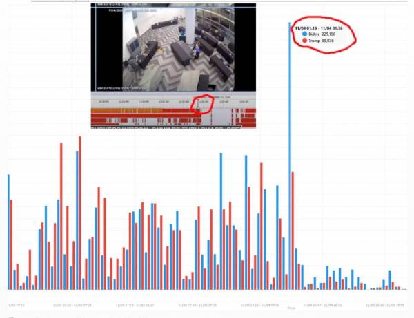 The Georgia spike in Biden ballots took place at 1:36 AM when the secret suitcase ballots were pulled out from their hiding place under the tables.