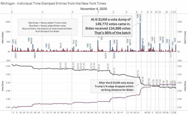 Like Georgia, this took place at 4:30 AM right before shift change around 5 AM. . New GOP observers were set to comin in at 6 AM. Republicans were told there was a break in voting so they could clean the room for coronavirus. That’s when the spike occurred in Joe Biden votes.