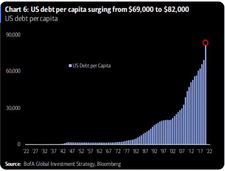 Per Capita debt per American has risen from roughly $69,000 to more than $81,000 (this reporter is old enough to remember that, once upon a time, Per Capita debt per American citizen was only a couple thousand dollars).