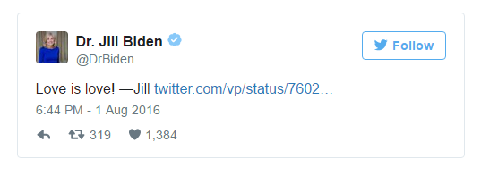 Biden’s wife, Jill, tweeted, “Love is love!” in response to her husband’s tweet.