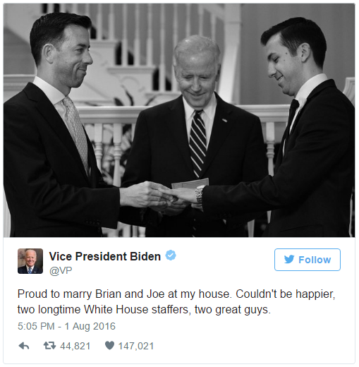 “Proud to marry Brian and Joe at my house,” Biden tweeted. “Couldn’t be happier, two longtime White House staffers, two great guys.”