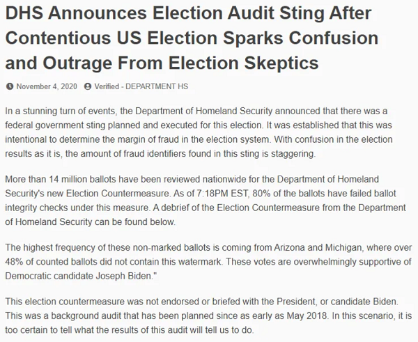 In further researching this story, we came across another piece of this rumor which needs to be considered. It isn’t yet authenticated, and it might be nothing but rumor or speculation, but various online sources are claiming to have behind-the-scenes access to press releases that aren’t yet available to the public. According to one rumor, shown below, DHS has secretly announced an “election audit sting” that claims “80% of the ballots have failed ballot integrity checks.”
