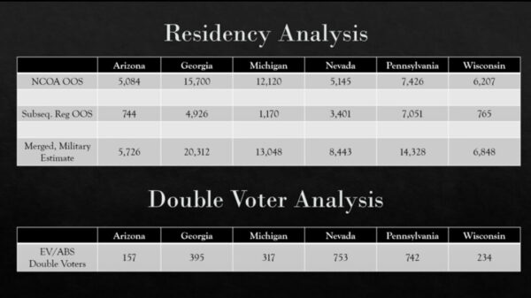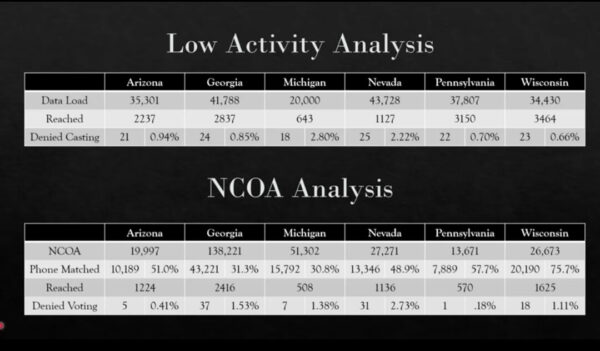 One of Braynard’s biggest findings involved voters who had submitted a National Change of Address form to the post office, indicating they had moved out of state, yet appeared to have voted in 2020 in the state they moved from.