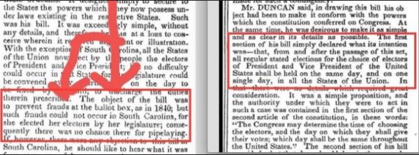 “The object of the bill was to prevent frauds at the ballot box as in 1840; but such frauds could not occur in South Carolina, for she elected her electors by her legislature; consequently there was no chance for pipelaying.”