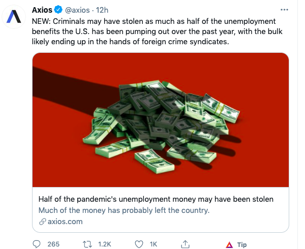 Axios released an article today detailing that half the unemployment aid issued over the past year was sent out of the country to foreign criminal organizations.