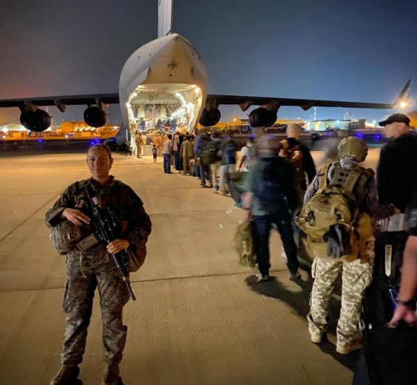 Picture of U.S. Marine Sgt. Nicole Gee helping evacuate people from Kabul, Afghanistan. She posted to Instagram with the caption, “Escorting evacuees onto the Bird,” followed by a heart emoji. (Screenshot via Instagram).