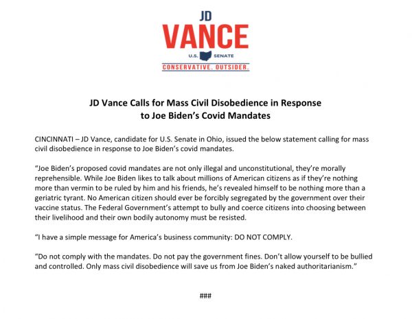 J.D. Vance: “Do not comply with the mandates. Do not pay the government fines. Don’t allow yourself to be bullied & controlled. Only mass civil disobedience will save us from Joe Biden’s naked authoritarianism.”