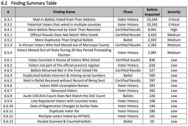 The Maricopa County forensic audit results have been leaked, and if the draft documents are correct, they already show over 54,000 fraudulent, faked and otherwise invalid ballots — more than five times the margin of “victory” for Joe Biden. (See the draft table below.)