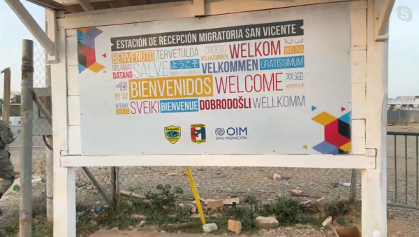 “Welcome” sign featuring multiple languages from around the world. In Espanol, it says “Migration reception station of San Vicente.”