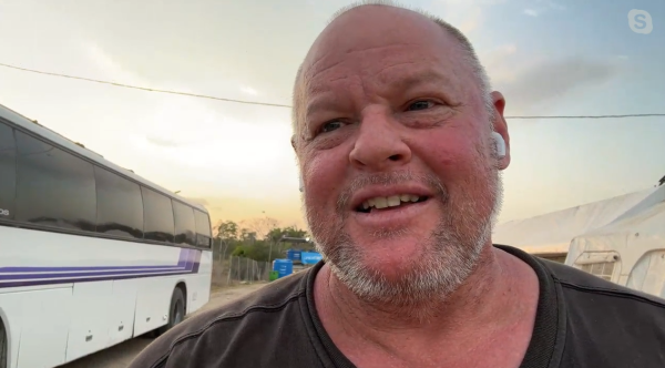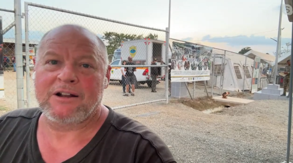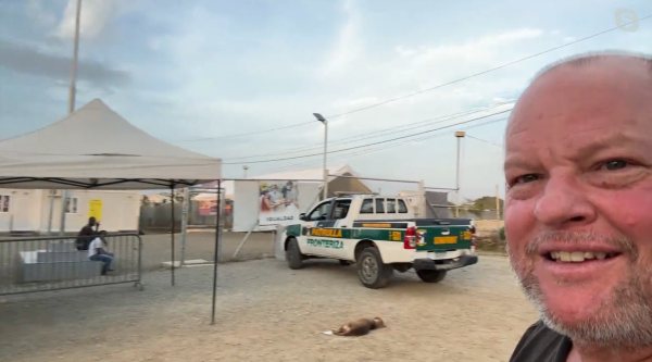 Michael Yon in front of one of the processing tents where migrants are granted passage and then transported by bus.