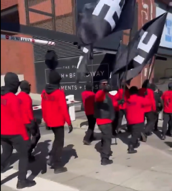 NEW: Blood Tribe, a neo-Nazi group, marches through downtown Nashville, Tennessee with swastika flags.